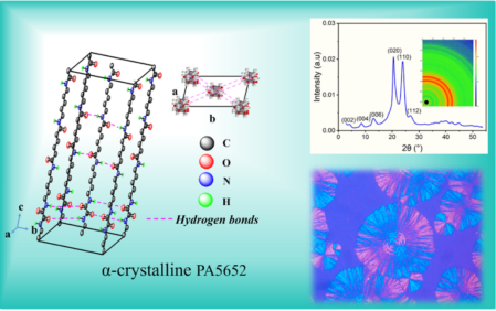 貴大新聞網訊(材料與冶金學院)近日,我校材料與冶金學院劉玉飛特聘教授團隊在生物基聚酰胺材料研究領域取得重要突破,相關成果以 Biobased Polyamide 5652 with α?Crystal Form: Characterization and Low Moisture Absorption為題,發表于高分子領域頂級期刊Macromolecules(自然指數期刊,中科院一區TOP)。貴州大學材料與冶金學院為論文第一完成單位,材料與冶金學院2022級碩士研究生王艷平為第一作者,劉玉飛特聘教授為通訊作者。近年來,生物基聚酰胺56(PA56)因其原料可再生、低碳環保而備受關注,但其特殊的分子結構(戊二胺單元含奇數碳原子)導致其晶體通常以γ晶型為主,飽和吸水率高達12%以上,在潮濕環境中力學性能顯著下降(如拉伸強度降低20%-30%),嚴重限制了在精密工程領域的應用,而傳統改性方法往往以犧牲材料其他性能為代價。針對這一難題,劉玉飛特聘教授創新性地提出了雙氫鍵結構調控策略:自主合成關鍵單體,設計并成功合成新型565二胺單體(C16H34N4O2),將565二胺與草酸二丁酯通過溶液聚合及